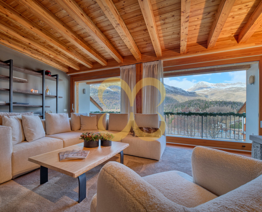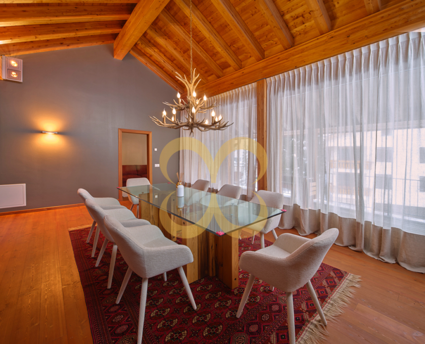 Sala da pranzo con uscita sul balcone con vista sulle montagne
