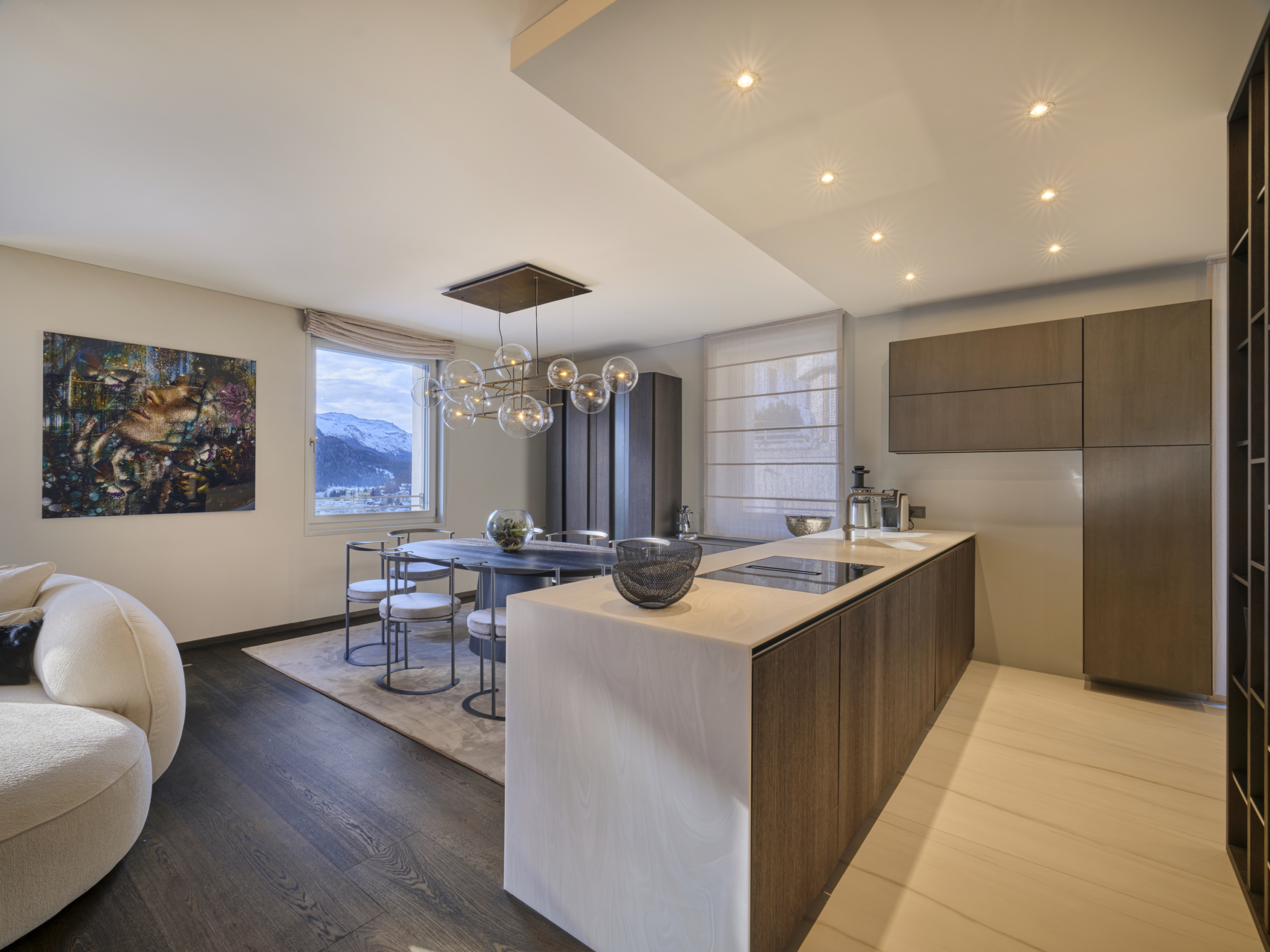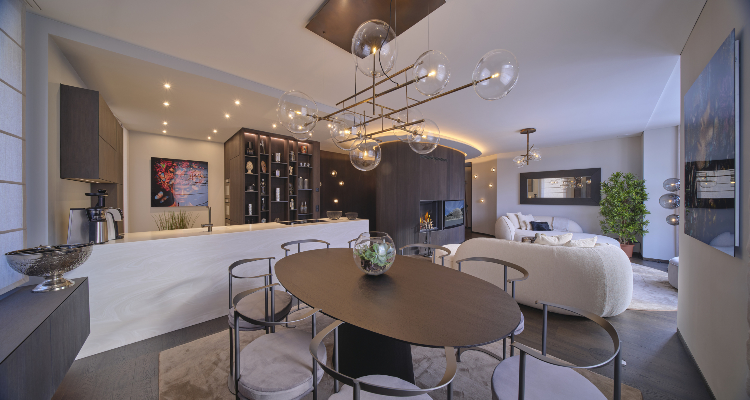 Die Wohnung Chic Retreat ist ein Beispiel für eine Renovierung, die Funktionalität und ästhetische Harmonie vereint. Die hellen, offenen Innenräume sind darauf ausgelegt, das natürliche Licht zu maximieren und hochwertige Materialien hervorzuheben. Küche mit Insel, Essbereich und Wohnzimmer mit Kamin schaffen eine elegante, einladende Atmosphäre, während die Schlafzimmer und privaten Räume Komfort und Ruhe bieten. Detailgenauigkeit und Materialqualität spiegeln das Maximum Wellbeing-Konzept in allen Bereichen wider.